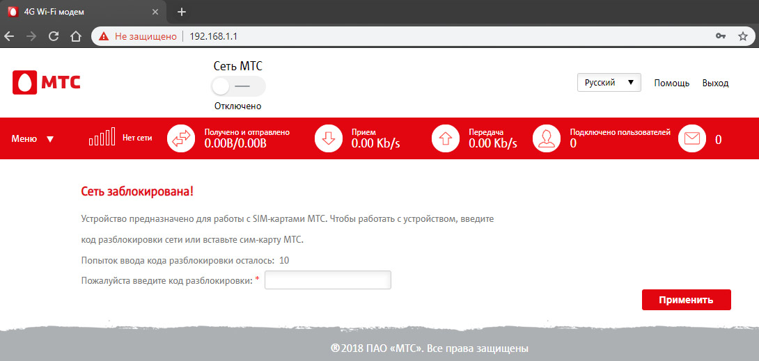 После ввода полученного кода разблокировки в веб-интерфейсе модема - он начинает работать с SIM картами любых операторов.