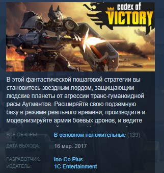 В игре Codex of Victory вам предстоит пройти протяженную сюжетную кампанию, в ходе которой придется строить и вести в бой армии боевых роботизированных машин, танков и вертолетов. Игра представляет собой смесь стратегии, строительства в реальном времени и пошагового тактического боя. Путешествуйте между планетами, сражайтесь и делайте всё возможное, чтобы остановить Аугментов.