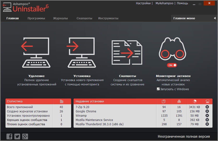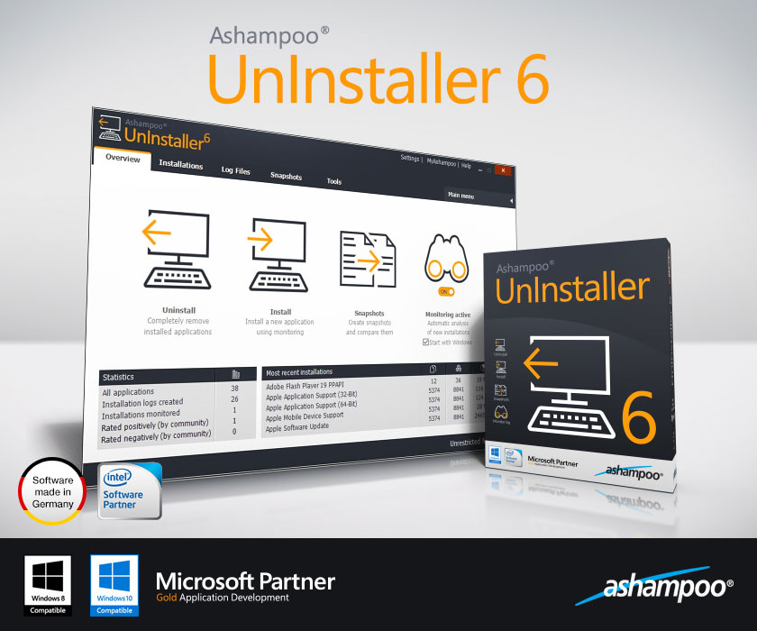 С помощью Ashampoo UnInstaller 6 Вы наконец может установить, попробовать, и удалить приложение без проблем. Более того: избавьтесь от нежелательного ПО мгновенно нажатием на кнопку! Испытайте самую продвинутую технологию контроля установки на сегодняшний день, и удаляйте приложения без следа. Новая разработка, создание снапшотов, позволяет Вам отслеживать изменения в системы с высокой скоростью и невероятным вниманием к деталям. И не забудьте об обслуживании системы: множество встроенных инструментов для обслуживания будут помогать Вам поддерживать Вашу систему в форме и на высокой скорости.