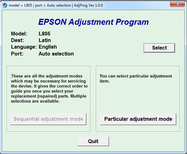 Adjustment program Epson L805 - это сервисная программа для указанных моделей принтеров, программа позволяет сбросить счетчик памперса (отрботка, абсорбер), прописывать ID печатающей головки, делать инициализацию принтера и другие функции.