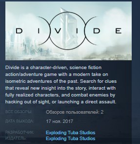 Divide is a character-driven, science fiction action/adventure game with a modern take on isometric adventures of the past. Search for clues that reveal new insight into the story, interact with fully realized characters, and combat enemies by hacking out of sight, or launching a direct assault.