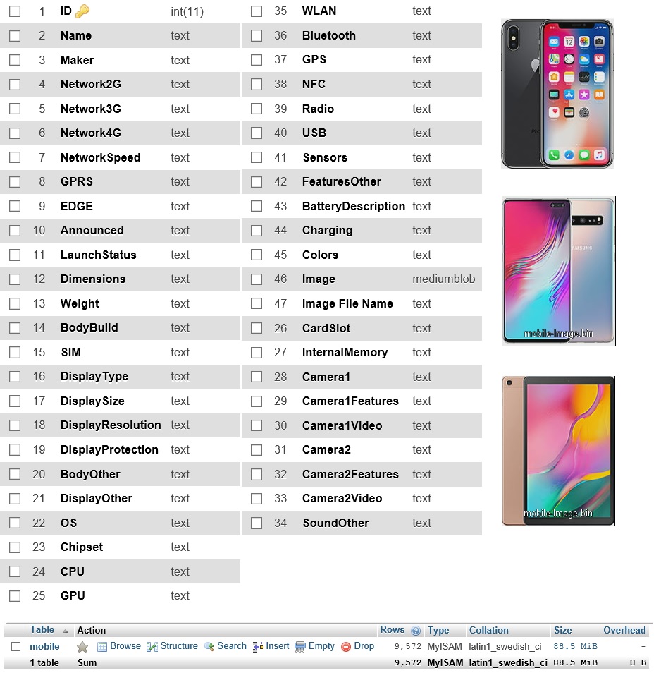 База данных, содержащая 9572 модели мобильных телефонов. Старые и новые модели. Это база данных MYSQL. Вы можете использовать его для своего сайта или любого другого проекта. База данных также содержит 1 маленькое фото каждого телефона.