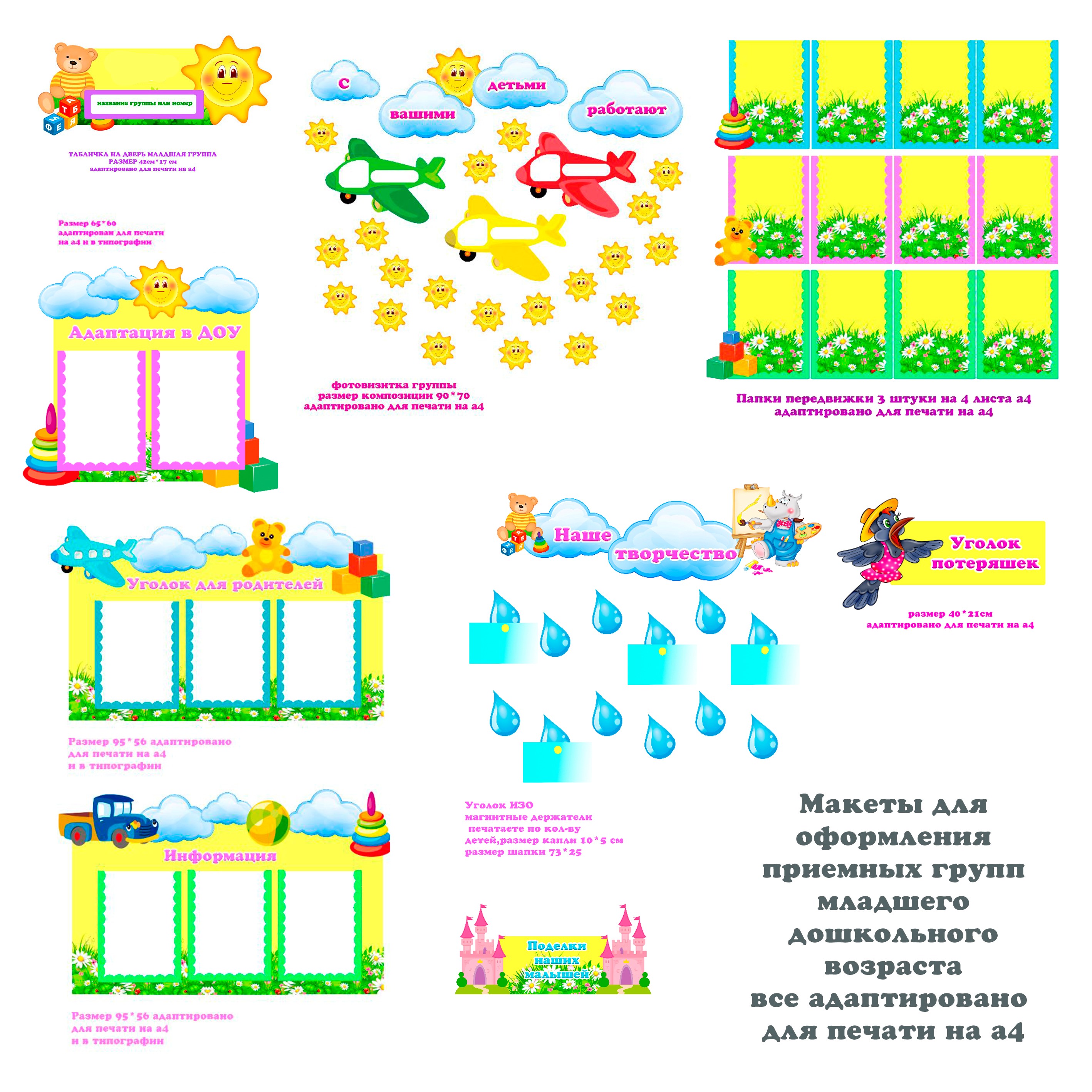 Макеты для оформления приемной,в комплекте:табличка на дверь,1 стенд информация,1 стенд уголок для родителей,уголок адаптации,папки передвижки,уголок потеряшек,уголок изо,фотовизитка группы ,уголок поделки