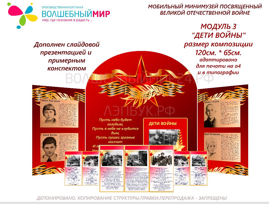 ✅Модуль 3 "Дети войны",дополнен карточками стойками с изображением ,примерным конспектом НОД и презентацией.Модуль адаптивен ,так же возможно собственное дополнение экспонатами.
