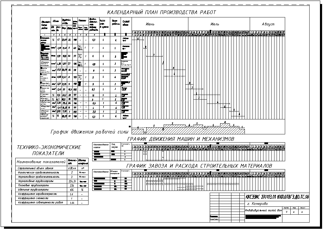 Лист 6. Особенности технологии возведения гражданских зданий: Календарный план производства работ с графиком движения рабочей силы, График движения машин и механизмов, График завоза и расхода строительных материалов, Технико-экономические показатели.