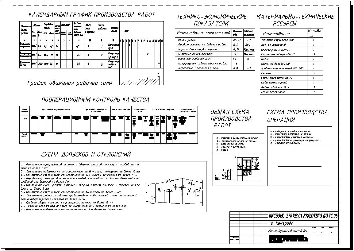 Лист 4. Особенности технологии возведения гражданских зданий: Календарный график производства работ с графиком движения рабочей силы, Технико-экономические показатели, Материально-технические ресурсы, Пооперационный контроль качества, Схема допусков и отклонений, Общая схема производства работ, Схема производства операций.