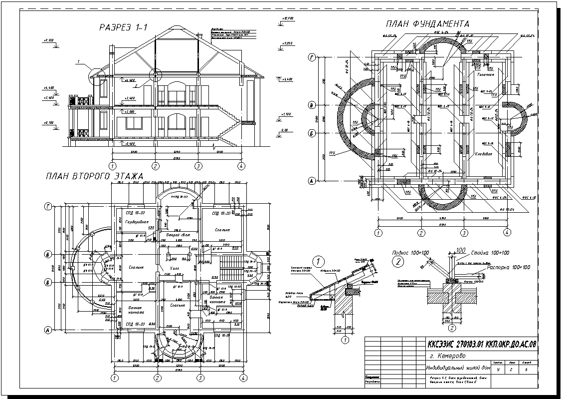 Лист 2. Особенности конструктивных решений: Разрез 1-1, План Фундамента, План второго этажа, Узел 1, Узел 2.