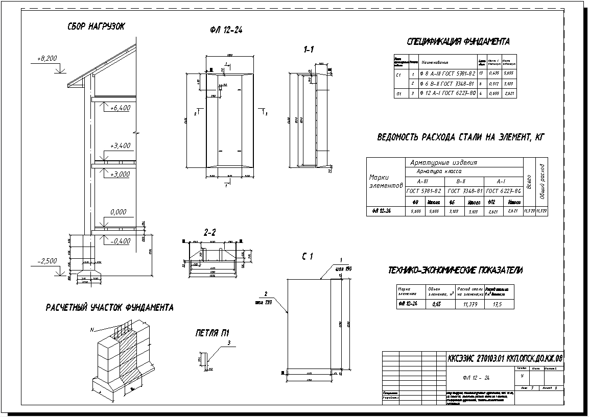Лист 3. Особенности проектирования строительных конструкций: Сбор нагрузок, ФЛ 12-24, 1-1, Спецификация фундамента, Расчётный участок фундамента, 2-2, С1, Петля П1, ,Ведомость расхода стали на элемен, кг, Технико-экономические показатели.
