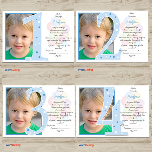 Готовые шаблоны 1-4 года приглашения на детский День Рождения для мальчика в формате Microsoft Word, с текстом на русском языке.