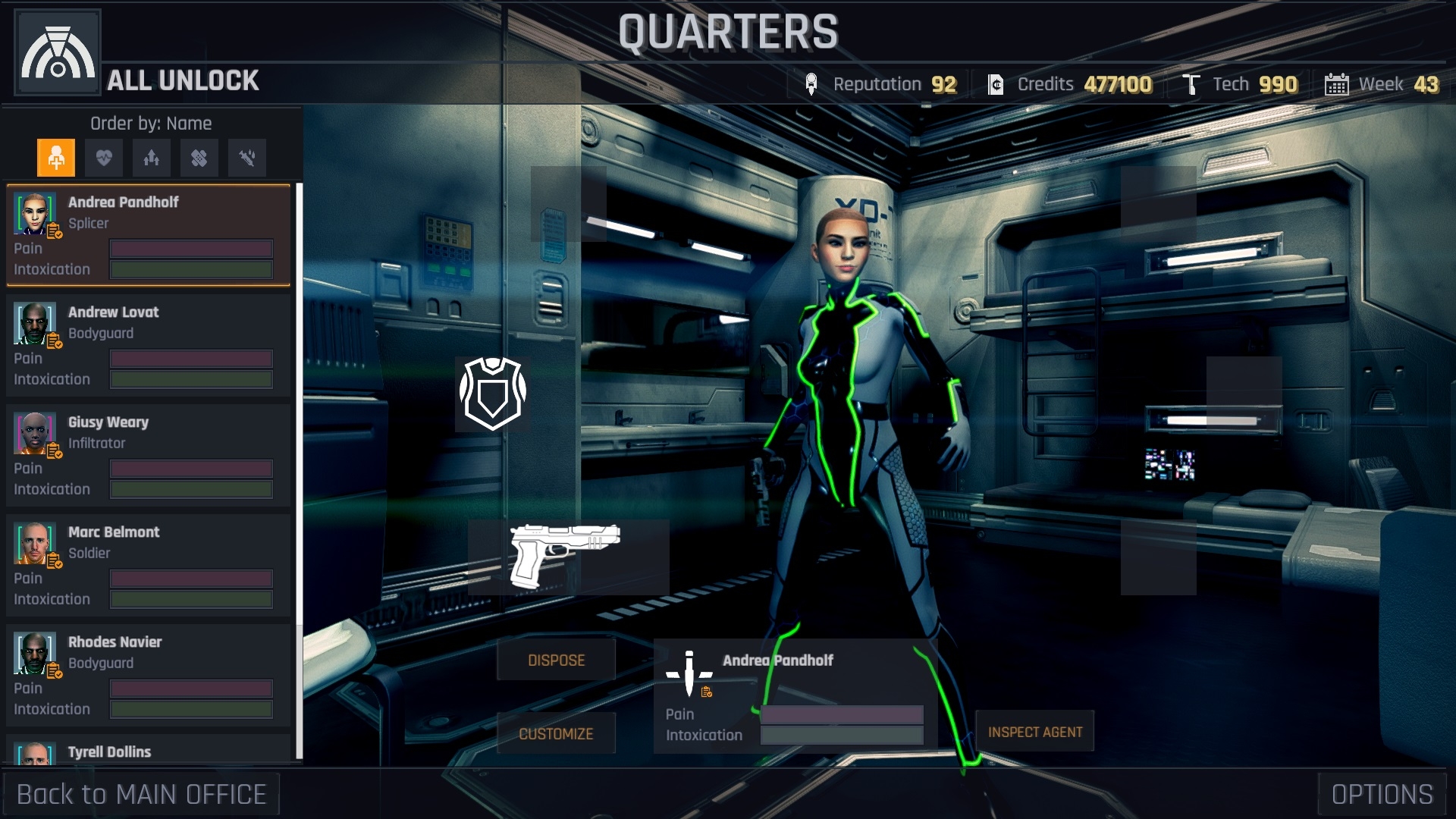 Будет добавлено позднее в разделе «Ранний доступ: наркотики и расстройства»: покупайте синтетические наркотики, чтобы временно усилить действие ваших агентов с риском развития у них психических расстройств *.
