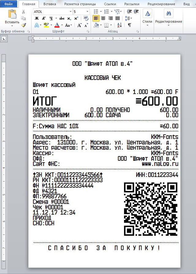 Распространенный шрифт в семействе кассовых аппаратов и фискальных регистраторов АТОЛ в формате TTF (русские и английские буквы) для использования в программе Microsoft Word, а так же в любых других текстовых редакторах. В архиве находятся шрифт в формате TTF и шаблон чека. Вам остается только установить шрифт в систему (обычно C:\WINDOWS\Fonts), открыть шаблон и начать редактирование. Печатать чеки предпочтительно на термопринтере, как, например, CITIZEN-S310, на кассовой термоленте. Хотя можно печатать и на струйнике и лазерном, с возможностью вывода на факсовую бумагу. Лучшее качество, естественно, при печати на термопринтерах.