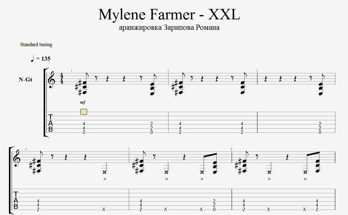 фингерстайл аранжировка для гитары на песню Mylene Farmer - XXL в форматах Guitar Pro и pdf