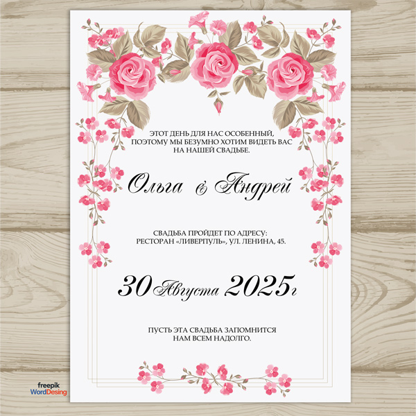 Красивый шаблон приглашения на свадьбу в формате Microsoft Word.Шаблон был сделан в программе Фотошоп и для удобства был переведен в Microsoft Word