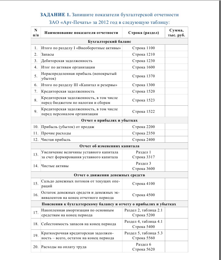 Задание 1 содержит таблицу, в которую вы должны записать необходимые показатели из бухгалтерской отчетности ЗАО «Арт-Печать» (всего их 20). Если вы на протяжении курса следовали нашим рекомендациям, то выполнение данного задания не составит для вас никакого труда. Вам нужно будет только открыть Приложение к кур¬су и переписать суммы из составленной отчетности в столбец 4 таблицы. Каждый верный показатель, записанный вами в таблице, оценивается в 1 балл.