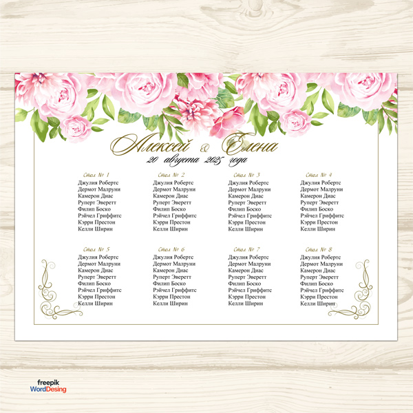 Дизайнерское панно для свадьбы с акварельными цветами, Вы легко можете изменить любой текстовый блок, изменить шрифт, число приглашенных, добавить или удалить текст.