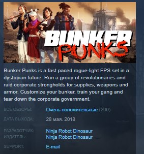 Bunker Punks is a fast paced rogue-light FPS set in a dystopian future. Run a group of revolutionaries and raid corporate strongholds for supplies, weapons and armor. Customize your bunker, train your gang and tear down the corporate government.