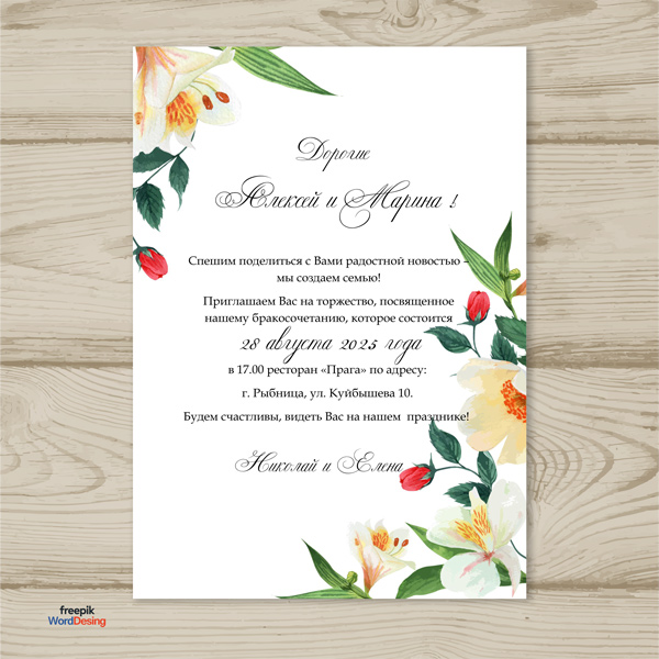 Красивый шаблон приглашения на свадьбу в формате Microsoft Word.Шаблон был сделан в программе Фотошоп и для удобства был переведен в Microsoft Word