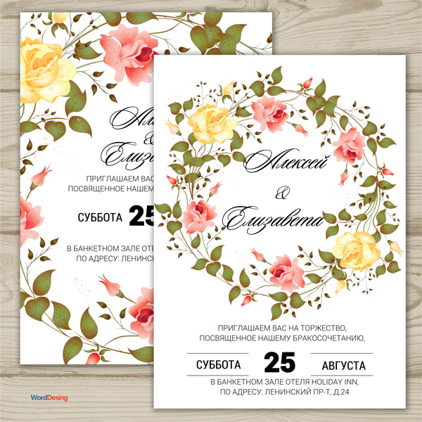 Красивый шаблон приглашения на свадьбу в формате Microsoft Word.Шаблон был сделан в программе Фотошоп и для удобства был переведен в Microsoft Word