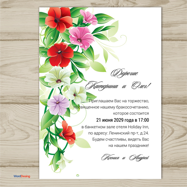 Макет приглашения был сделан в размере А4 (210х297 мм),Вы легко можете изменить размер на свой.