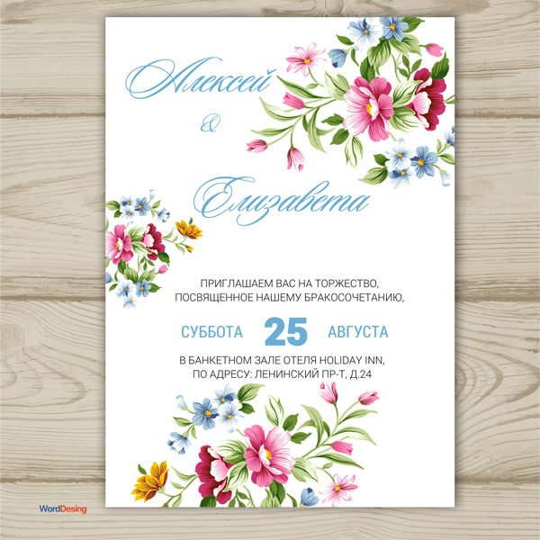 Красивый шаблон приглашения на свадьбу в формате Microsoft Word.Шаблон был сделан в программе Фотошоп и для удобства был переведен в Microsoft Word