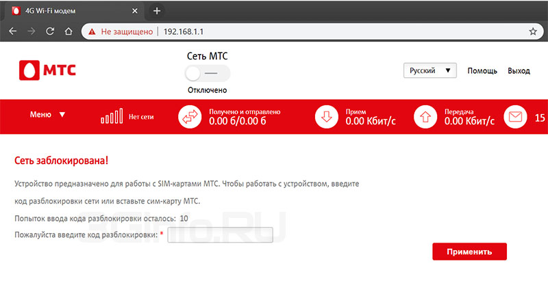 После ввода полученного кода разблокировки в веб-интерфейсе Wi-Fi модема МТС 8430FT - он начинает работать с SIM картами любых операторов.