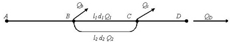 Горизонтальный трубопровод из стальных труб, схема которого показана на рис. 1, имеет участок с параллельным соединением труб, состоящим из двух линий длиной l1 и l2 и диаметрами d1 и d2. В точке В задан расход QВ.