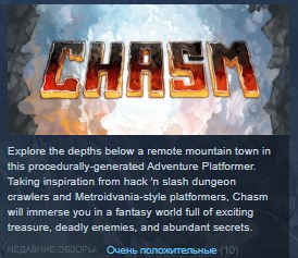 Welcome to Chasm, an action-adventure game in which you play a new recruit undertaking your first mission for the Guildean Kingdom. Thrilled to prove your worth as a knight, you track strange rumors that a mine vital to the Kingdom has been shut down. But what you discover in the mining town is worse than you imagined: The townspeople have disappeared, kidnapped by supernatural creatures emerging from the depths.