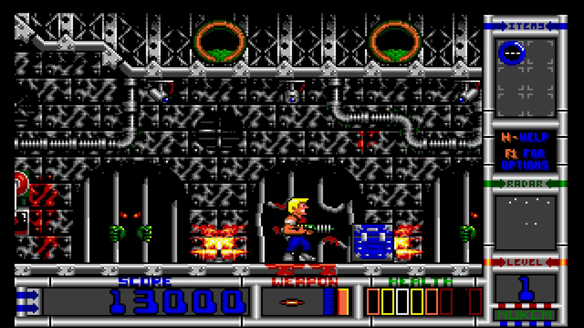 Теперь ему предстоит пройти через четыре эпизода, каждый из которых состоит из множества уровней с различным графическим дизайном. На своем пути Дюк должен уничтожить множество препятствий и врагов - и силы Ригелатина, и местную дикую природу. Первоначально у Дьюка была только слабая лазерная винтовка, но он также может найти огнемет (который позволяет ему стрелять, чтобы запустить себя в воздух), ракетную установку или гораздо более мощную лазерную пушку. Это более сильное оружие, однако, имеет ограниченные боеприпасы.