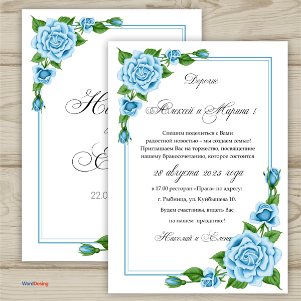 Красивый шаблон приглашения на свадьбу в формате Microsoft Word.Шаблон был сделан в программе Фотошоп и для удобства был переведен в Microsoft Word