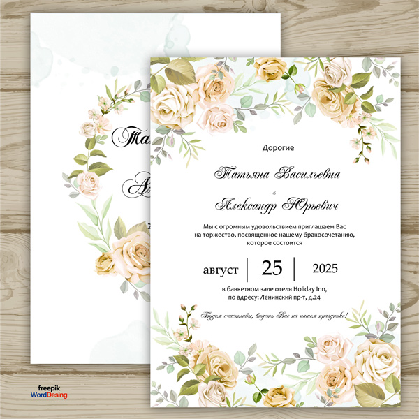 Красивый шаблон приглашения на свадьбу в формате Microsoft Word.Шаблон был сделан в программе Фотошоп и для удобства был переведен в Microsoft Word