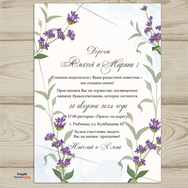 Красивый шаблон приглашения на свадьбу в формате Microsoft Word.Шаблон был сделан в программе Фотошоп и для удобства был переведен в Microsoft Word
