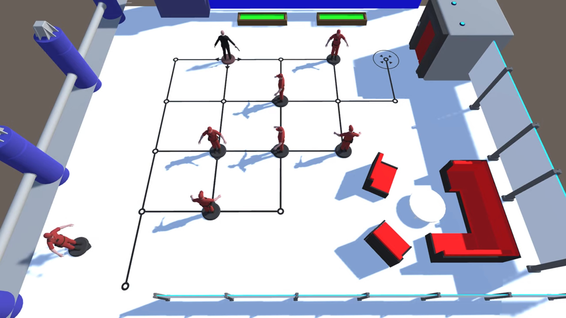 Добро пожаловать в тактик. Это пошаговая стратегия. Вы управляете убийцей и проходите через охрану и рабочих. Ваша цель-добраться до двери и устранить цели, если это возможно. Вы делаете ход-противник тоже делает ход. Движение происходит строго по линиям, направление движения влияет на атакующую сторону. Некоторые цели также могут поворачиваться или стоять неподвижно.