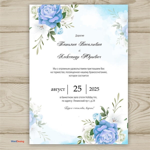 Красивый шаблон приглашения на свадьбу в формате Microsoft Word.Шаблон был сделан в программе Фотошоп и для удобства был переведен в Microsoft Word