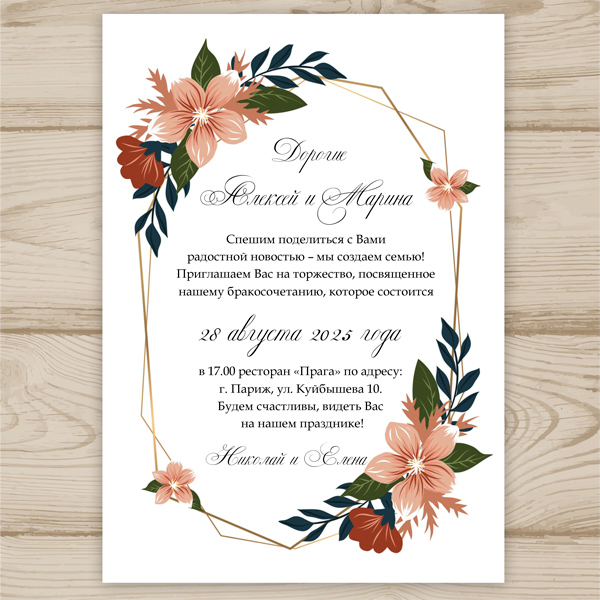 Макет приглашения был сделан в размере А4 (210х297 мм),Вы легко можете изменить размер на свой.