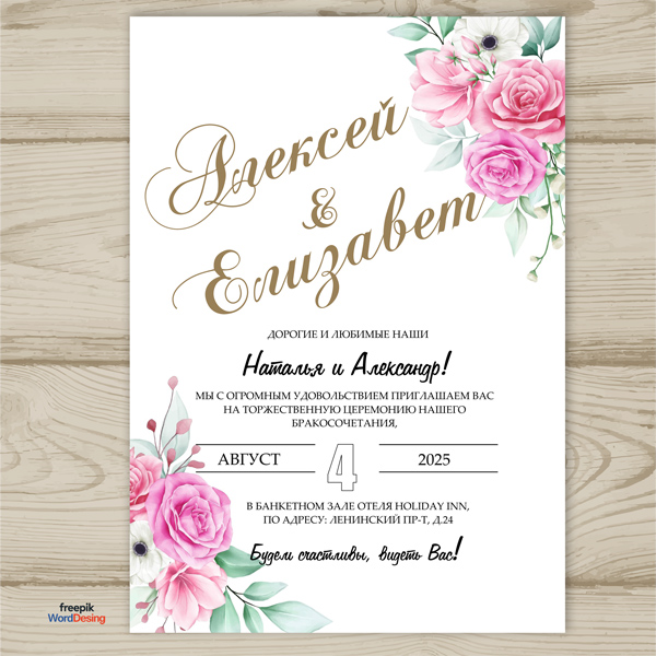 Красивый шаблон приглашения на свадьбу в формате Microsoft Word.Шаблон был сделан в программе Фотошоп и для удобства был переведен в Microsoft Word