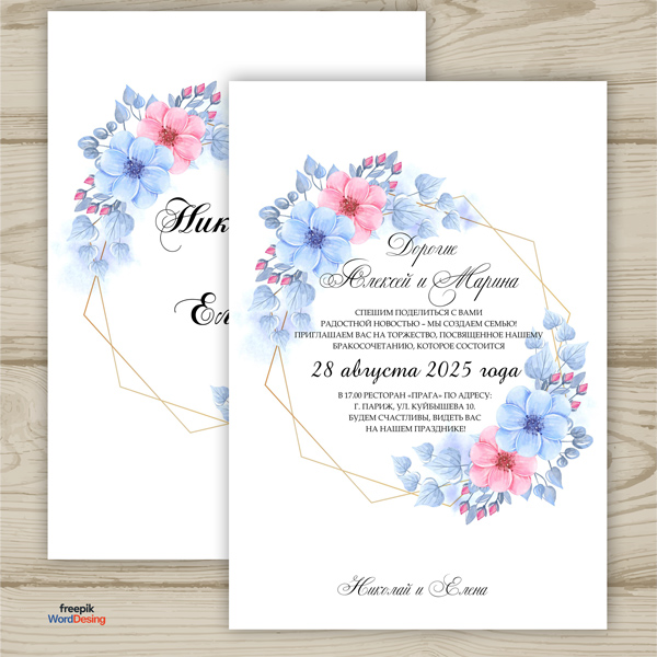 Приглашения на свадьбу сделано в профессиональных дизайнерских программах и для удобства и легкости редактирования текста было переведено в формат Microsoft Word, что дает Вам с легкостью поменять/добавить текст, размер шрифта, цвет текста.