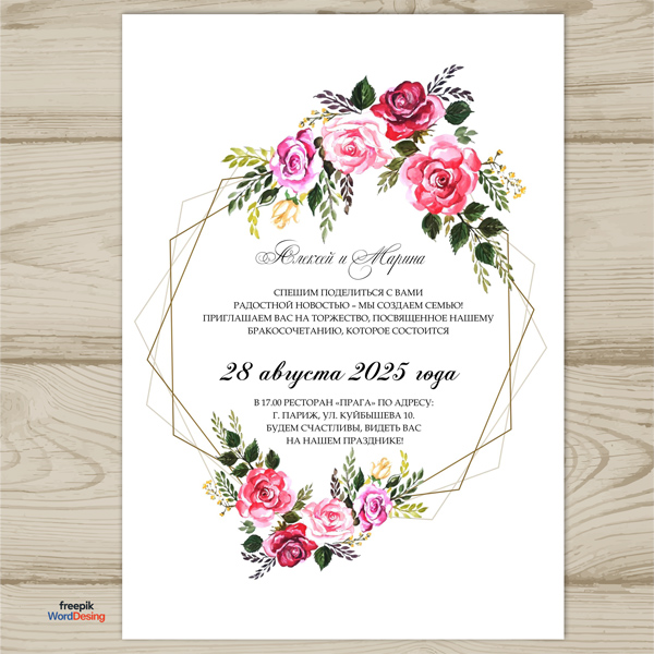 Приглашения на свадьбу сделано в профессиональных дизайнерских программах и для удобства и легкости редактирования текста было переведено в формат Microsoft Word, что дает Вам с легкостью поменять/добавить текст, размер шрифта, цвет текста.