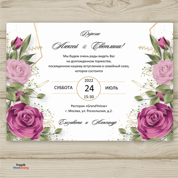 Приглашения на свадьбу сделано в профессиональных дизайнерских программах и для удобства и легкости редактирования текста было переведено в формат Microsoft Word, что дает Вам с легкостью поменять/добавить текст, размер шрифта, цвет текста.