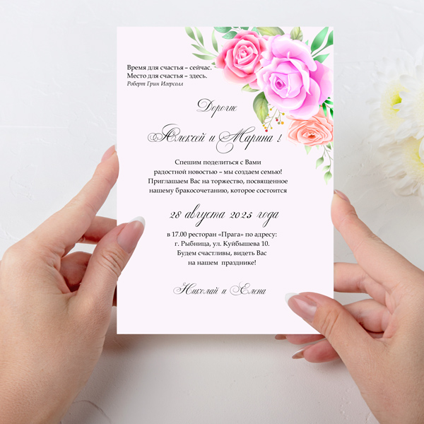 Приглашения на свадьбу сделано в профессиональных дизайнерских программах и для удобства и легкости редактирования текста было переведено в формат Microsoft Word, что дает Вам с легкостью поменять/добавить текст, размер шрифта, цвет текста.
