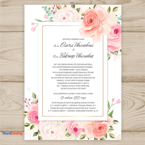 Приглашения на свадьбу сделано в профессиональных дизайнерских программах и для удобства и легкости редактирования текста было переведено в формат Microsoft Word, что дает Вам с легкостью поменять/добавить текст, размер шрифта, цвет текста.