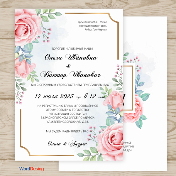 Приглашения на свадьбу сделано в профессиональных дизайнерских программах и для удобства и легкости редактирования текста было переведено в формат Microsoft Word, что дает Вам с легкостью поменять/добавить текст, размер шрифта, цвет текста.
