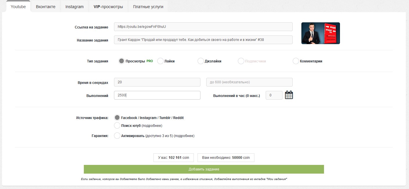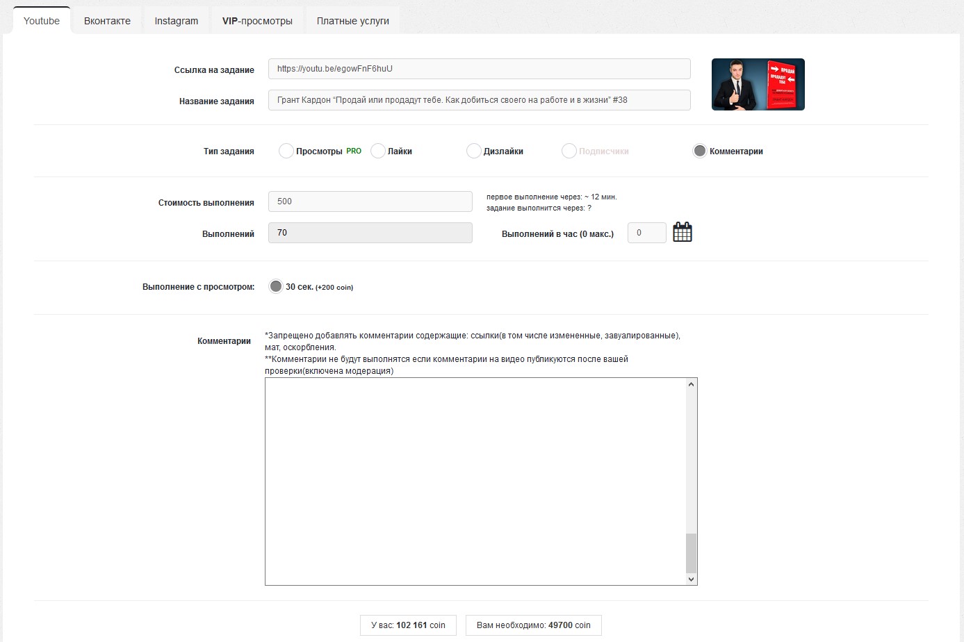За 500 000 coin, к примеру, можно заказать для Youtube: