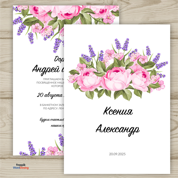 Приглашения на свадьбу сделано в профессиональных дизайнерских программах и для удобства и легкости редактирования текста было переведено в формат Microsoft Word, что дает Вам с легкостью поменять/добавить текст, размер шрифта, цвет текста.Данный макет может быть распечатан как вертикально так и горизонтально в виде открытки.