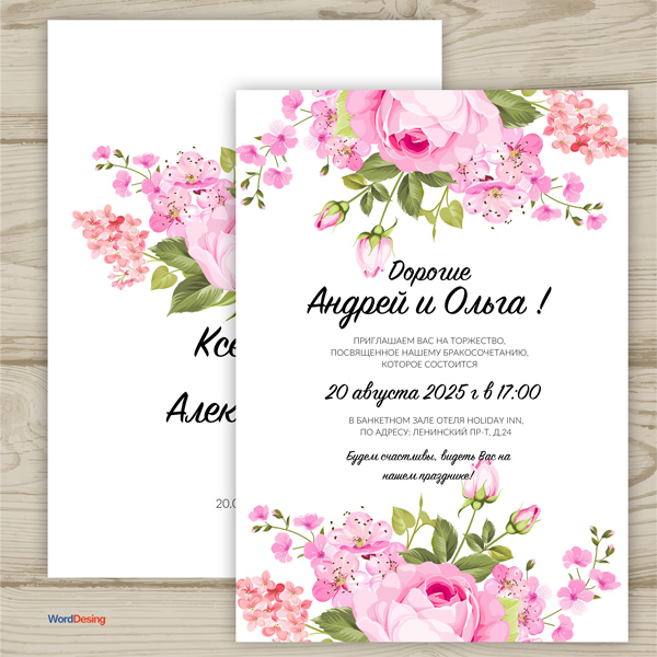 Приглашения на свадьбу сделано в профессиональных дизайнерских программах и для удобства и легкости редактирования текста было переведено в формат Microsoft Word, что дает Вам с легкостью поменять/добавить текст, размер шрифта, цвет текста.Данный макет может быть распечатан как вертикально так и горизонтально в виде открытки.