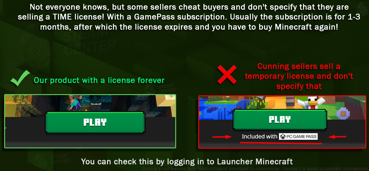 (2в1! Java & Bedrock Edition!) Лицензия КУПЛЕНА навсегда! Это НЕ временная подписка GamePass, когда у вас через месяц-два заканчивается срок действия лицензии (см.скриншот) как продают хитрые продавцы и не указывают об этом, мы продаем лицензию НАВСЕГДА! Minecraft останется на вашем аккаунте навсегда!
