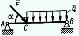 На балку АВ действуют распределенная нагрузка интенсивностью q = 2 Н/м и сила F = 6 Н. Определить реакцию опоры В, если длина АС = 1/3 АВ, угол 45°.