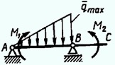На балку АС действуют распределенная нагрузка интенсивностью qmax =2,5 Н/м и пара сил с моментами М1 = 4 Н*м и М2 = 2 Н*м. Определить реакцию опоры В, если длина АВ = 4 м, ВС = 0,5 АВ.
