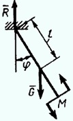 Маятник находится в равновесии под действием пары сил с моментом М = 0,5 Н*м и второй пары сил, образованной весом G и опорной реакцией R. Найти значение угла ф отклонения маятника в градусах, если G = 10 Н и расстояние l = 0,1 м.