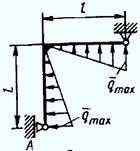 На раму действует распределенная нагрузка интенсивностью qmax = 20 Н/м. Определить реакцию опоры А, если размер l = 0,3 м.