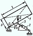 Кузов 1 весом G = 10 кН удерживается в равновесии силовым гидроцилиндром 2. Определить в кН силу, действующую на шток 3 гидроцилиндра, если расстояния l = 3 м, b = 1,2 м, АО = 1 м и угол а = 30°.